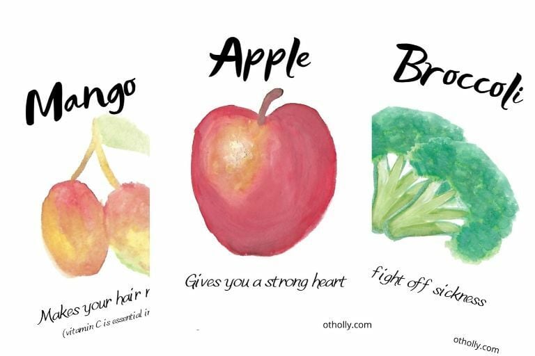 You'll get a PDF printable of 29 hand painted fruit and vegetable cards. Each containing an explanation of the health benefits of each food. In kid language.
